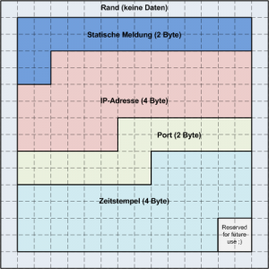 Was liegt da näher, als ein paar “persönliche Informationen” des Benutzers zu nehmen, im Endeffekt sieht ja sowieso nur er dieses Bild. Und was ist das Persönlichste, was der Internet-Datenverkehr zu bieten hat? Richtig, die IP-Adresse. Zusammen mit der Uhrzeit des Zugriffs wird der Benutzer nämlich recht identifizierbar (allerdings nur bei Verdacht auf eine Straftat… oder wenn der Sysadmin des Providers nix zu tun hat 😛 ). Ich habe mich schließlich dazu entschlossen, die IP-Adresse (4 Byte bei IPv4, IPv6 unterstütze ich grade nicht), den verwendeten Port (2 Byte) und die Uhrzeit (nochmal 4 Byte) zu benutzen, zusammen mit einer kleinen statischen Nachricht (2 Byte). Da diese Informationen insgesamt nur 12 Byte benutzen hatte ich also noch ein bisschen Platz. Aber dieses “Problem” war auch schnell gelöst.